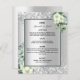 Personalise and add your names, date and the wedding menu. Faux silver looking background, decorated with white flowers and greenery, confetti.