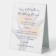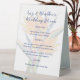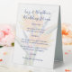 Wedding menu printed on a standing, plastic sign. Bird of paradise flowers decorate both sides of this white tented table sign. Customise the dark blue text with a title and list of menu items offered at the reception, rehearsal dinner, or other pre-wedding celebration.