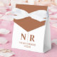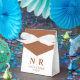 Featuring a minimalist design with bride and groom initials, these favour boxes boast simple typography against a backdrop of terracotta and white. This classic yet trendy combination exudes timeless charm, perfect for couples seeking an elegant and understated aesthetic for their wedding.