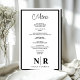 Each menu is meticulously crafted with a classic white backdrop, adorned with a sleek black wedding monogram that adds a touch of timeless elegance. Personalised with your names and event details, this menu becomes a cherished keepsake of your special day, setting the tone for an unforgettable celebration.