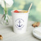 Custom Boat name or Family name, Welcome Aboard, nautical navy blue anchor and text and white wedding Paper Cups.