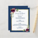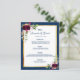 An elegant bohemian boho style wedding menu card. Feathers and lush watercolored roses in burgundy. Templates for your names, date and the wedding menu. A faux gold frame and a chic navy blue and white background. Navy blue coloured letters.