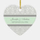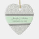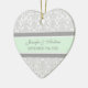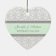 Customisable name and date wedding ornament in elegant and modern light pastel mint green, grey and white classic floral damask pattern. Perfect as a christmas keepsake to remember your special day or celebrate your first christmas or as personalised wedding favours for your guests.