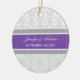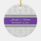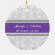 Customisable name and date wedding ornament in elegant and modern dark purple, grey and white classic and romantic floral vintage damask pattern. Perfect as a christmas keepsake to remember your special day or celebrate your first christmas or as personalised wedding favours for your guests.