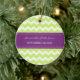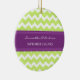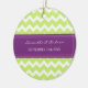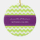 Customisable name and date wedding ornament in elegant and modern chartreuse lime green, eggplant dark purple and white fun chevron zigzag pattern. Perfect as a christmas keepsake to remember your special day or celebrate your first christmas or as personalised wedding favours.