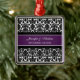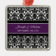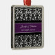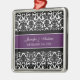 Customisable name and date wedding ornament in elegant and modern eggplant dark purple, black and white classic floral damask pattern. Perfect as a christmas keepsake to remember your special day or celebrate your first christmas or as personalised wedding favours for your guests.