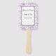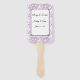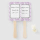 This wedding paddle fan is shown in a lavender floral background print with sample names and date, customise and change the text to yours.