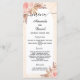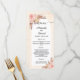 An elegant bohemian boho style wedding menu card. Personalise and add your names, date and the celebration menu. Arch frame and golden marble print as background. Decorated with blush pink florals and pampas grass.