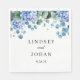 This wedding paper napkin is shown with a lovely blue hydrangea floral watercolor print.