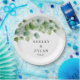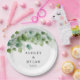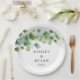 This wedding paper plate is shown with a eucalyptus vine leaves art print.
