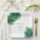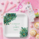 This wedding designed paper plate is shown with a lovely green mix floral print. Text colour is green.