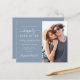 Budget-friendly dusty blue wedding save the date announcement featuring your photo and "Happily Ever After" in a mix of simple modern white typography and a stylish white script with swashes. Personalise your save the date details and add your names in a signature-like script. Your names and wedding date are joined together by a heart on the back.