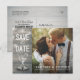 Save The Date Wedding Invitation Photo Postcard Templates - Elegant Lettering Script, Vintage Champagne Glasses and String Lights on Rustic Wood Background.