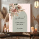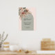 A soft blush pink background, with a sage green coloured arch frame, adorned with muted, earthy roses, eucalyptus greenery, and pampas grass. Personalise and add your names and wedding date.