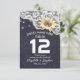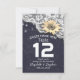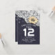 Wedding Seating Place / Table Number / Escort Card Templates - Elegant Sunflowers, Vintage Lace Frame and Chic String Lights on Navy Blue Background.