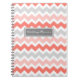 Spiral wedding planner journal with elegant coral orange pink, charcoal grey and white retro and casual chevron zigzags stripes pattern, with customisable text to add your own message. Perfect for organising wedding plans and details, a great gift for the bride to be.