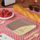 A very modern wedding paper plates set in bold text of the colours Mocha Mousse and a Creamy Yellow.