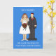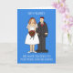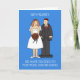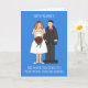 A simple illustration of a bride and groom standing against a bright blue coloured background. The image is accompanied by the words 'With regret we have decided to postpone our weedding'.