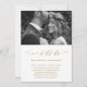 Elegant change the date wedding postponement announcement. This simple announcement is a chic way to let invited guests know that your wedding date has been rescheduled due to unforeseen circumstances, and includes the new wedding date. This trendy announcement features lovely "we still do" faux gold calligraphy script on a white background with the couple's photo.