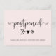 Let your guests know that there's been a change of plans and your wedding date has been postponed with this chic light pink wedding postponement announcement. "postponed" is written in stylish modern typography and underneath, pointing to a future of love, is an arrow and heart. You can personalise your names and postponement announcement on the front of the card and provide more details on the reverse side ( e.g., a new date or whether a new date will be forthcoming when you have one).