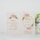 A folded wedding program on marble background, with pink and white orchid decorations and an irregular gold hexagon around the text on the front cover, with pink orchids up and down over it.