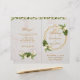 The text has a golden colour, like the gold hexagon, and the titles and the names of the Bride and Groom are written in an elegant calligraphic script. It has the wedding ceremony and the wedding party on the inside and a thank you message on the back cover.