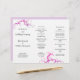 Wedding program template in white with magenta flourish design. Sample is shown on pretty, and affordable, linen paper with custom text in three sections to be folded in thirds after purchase. Embellishments, in the form of leafy swirls of colour, decorate the left side of the paper, which will be the front of the program. Another flourish of colour is at the bottom between the centre and last page. Fold this paper like an accordion and be sure to double-check all text for correct spelling and placement. The reverse is a solid lavender colour.