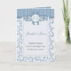 This enchanting Wedding Program or Order of Service in shades of pale blue combines a bold striped band and a modern version of the vintage damask pattern to create the background. A pale blue rectangle with faint drop shadow gives the illusion of a double layer upon which the text is added. To the front of the program, an ornate, vintage scrollwork frame encompasses monograms of the Bride and Groom. Matching items and alternate colours are available in store.