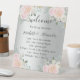 A welcome/program, timeline poster for a wedding. A stylish faux silver looking background decorated with blush pink and white flowers. Personalise and add your names and the details. Black letters.