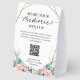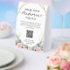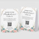 This is a folded table tent wedding sign designed to collect photos and videos from your guests. It stands on its own and is printed on both sides, so it’s easy to place on reception tables, bars, or near the entrance where guests can scan and upload throughout the event.