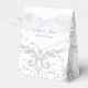Shown here is the tent style favour box. This box coordinates with the temple wedding invitation and reception invitation. Has the Silver Coronation pattern on all sides of this favour box. Personalised names of the newlyweds across the top flap. To personalise the names, click the "unfolded" button after clicking customise button. Customise this item to your desires.