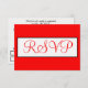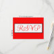 Solid red background. RSVP is written in elegant script inside white and black geometric rectangle. Personalise backside details in black typography against crisp white background. Original Designs by TamiraZDesigns.