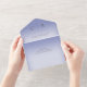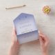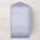 AVAILABLE WITH OR WITHOUT A QR CODE TO SCAN. This simple yet elegant design has a modern look, with two interlocked gold wedding rings on a soft white blur overlay on a soft periwinkle blue background. Personalised All-In-One invitations are a unique combination of both a beautifully printed custom invitation with an easy to tear off perforated RSVP postcard. And they are so easy to use! You simply fold, then seal the back flap with the three included clear stickers, and mail. And when your guests receive your custom invite, they just tear the perforated RSVP Card off and drop it back in the mail to you!