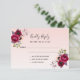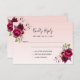 An elegant, romantic RSVP card for a wedding with templates for reply by date and names. A soft rose gold gradient, ombre background. Decorated with dark purple and burgundy and rose pink watercolored flowers. The title Kindly Reply is written with a modern hand lettered style script.