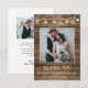 Your wedding photo is accented with a rustic, country, brown weathered wood plank background and soft yellow glow string lights and mason jar lanterns along with the editable title of THANK YOU and your wedding date in a country western hand-printed font and your names in a rough brush script font. The back of the card features another photo and offers the option to type a general thank you message (or delete the sample text to leave blank for personal handwritten notes of appreciation). PHOTO TIP: For fastest/best results, choose a photo with the subject in the middle and/or pre-crop it to a similar shape as shown BEFORE uploading. Contact the designer via Zazzle Chat or makeitaboutyoustore@gmail.com if you'd like any customisation or want coordinating items.