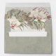 Complete your wedding invitation suite presentation with these exquisitely elegant coordinating envelopes. Hand painted watercolor vintage style, textural background in dusty muted sage green for the exterior and soft off white for the interior. Design motif has earth tone palm and monstera jungle leaf foliage along with white orchids. The design pattern continues on the inside flap. Artwork created by internationally licensed artist and product designer, Audrey Jeanne Roberts, copyright.