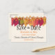 Send off the "Save The Date" announcement for your autumn wedding date with a top border of colourful fall leaves and firefly lights on a string. Personalise the front and back text in the template fields or click customise to select a typeface style, size, and colour you prefer.
