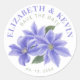 Designed in gentle watercolor hues, this round floral sticker features lush purple clematis flowers and customisable names and date — perfect for sealing envelopes, decorating favours, or adding a personal touch to your Save the Date cards.