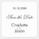 A Save the Date sticker for your wedding. A stylish white background, black text. Personalise and add your names and wedding date.