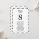 Make a sophisticated statement with this double-sided wedding table number and guest list card, featuring a graceful black wavy frame border on both sides for a polished, cohesive look. Designed in timeless black on crisp white, this 5" x 7" template showcases a bold serif table number, italicised guest names, and the word "Table" in a chic handwritten script font. Both sides of the card are identical, allowing for easy viewing from any angle—perfect for weddings, anniversaries, or engagement parties. Personalise with your guest names and details, or request a custom colour to match your theme. Part of our coordinating black and white wedding collection with handwritten-style script, this minimalist table card adds a refined and modern touch to your celebration decor!