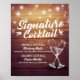 Signature Cocktail Drink Menu Wedding Decor Poster Templates - Elegant Lettering Script, Vintage Champagne Glasses and String Lights on Rustic Wood Background.