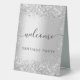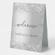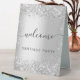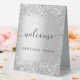 A welcome sign for a party. A stylish faux silver looking background decorated with confetti. Personalise and add your name. Black letters.