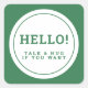 Social distance wedding green hello sticker. Help your guests feel safe and let other guests know you are happy with touching. Code green wedding sticker reads Hello! Talk and hug, if you want. Ideal to add to a guest virus safety wedding kit or event kit. Matching posters and instructions are also available. Designed by www.mylittleedenweddings.com