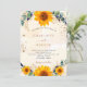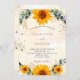 A white and golden watercolored background decorated with sunflowers, eucalyptus greenery and golden leaves and faux gold glitter dust. Personalize and add your names and party details.