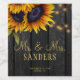Modern newlyweds name wedding personalised wine label with a yellow gold sunflowers bouquet over a dark brown barn wood with string lights. ++++++++++ Easy to customise with your name and text! +++++++++ It can be a pretty gift for the new couple, a party table decor, or a wedding thank you favour.
