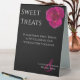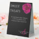 Enhance your wedding reception decor with this modern and elegant Tabletop Sweet Treats Sign in Black and White with Fuchsia Orchids. This beautifully designed sign seamlessly blends with your theme, adding a touch of elegance to your table. Explore the Collection for a beautifully modern-themed wedding.