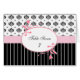 A trendy table number card for a wedding reception with a chic black and white damask pattern on the top and sassy pinstripes on the bottom, divided by a girly pink floral frame. Personalise by adding the table number.