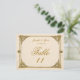 This custom double sided Wedding Table Number Card features a distressed, vintage parchment paper style background in creamy neutral shades with an antique style ornamental fram in golden tones.