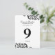 Guide you guests with these elegant wedding table cards. Tasteful scrolls adorn these cards with a clear distinct number. Personalised the header with your names and wedding date. Input a table number and add one card to your cart. Go back and change the table number so you have one card for every table. Numbers do not serialised on their own.