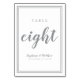 This design was created for smaller intimate wedding celebrations. Simple, minimalist and elegant Wedding Table Number EIGHT design features a contemporary design with a double frame border in ultimate grey on a crisp white background. The chic design provides timeless yet modern sophistication. Personalise wedding table design with your wedding details in sophisticated grey lettering and script. The back of the card is a duplicate of the front. Order one for every table with the individual table numbers.